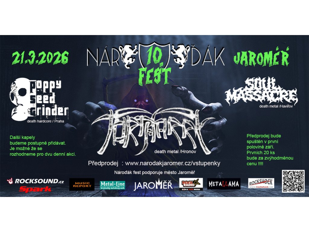 Už 21. 3. 2026 se Jaroměřský Nároďák otřese v základech! Přijďte oslavit jubilejní 10. ročník Nároďák Festu, který je zároveň oslavou deseti let Hudebního klubu v Jaroměři.